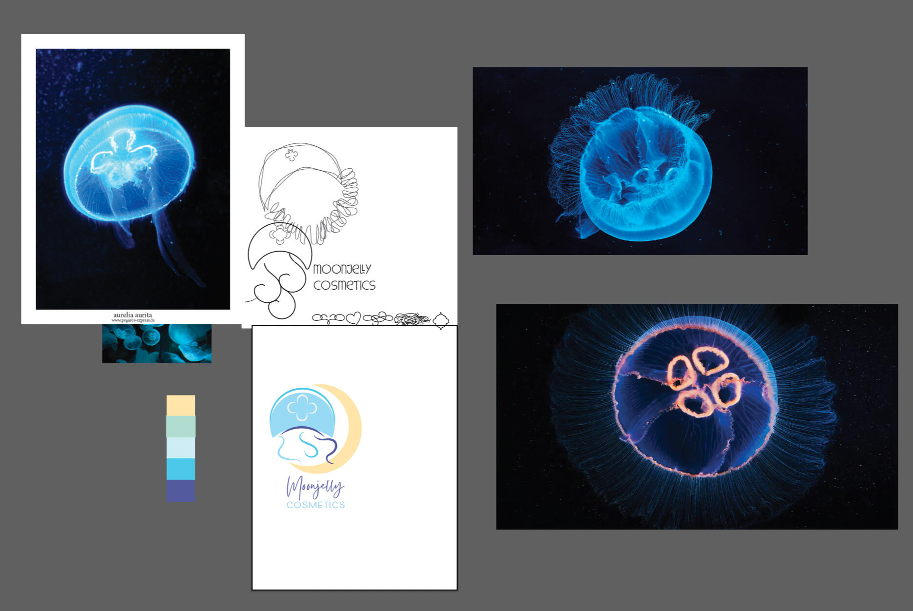 Referencing actual pictures, I simplified the jellyfish and kept the iconic mark on the top of their head for recognition. It is the same reason I added the crescent moon. The brand I ended up doing was a skincare brand, because skincare products are becoming more trendy, with things like jelly face masks. I wanted the brand to be sophisticated, yet something fun you would see advertised on Soko Glam.