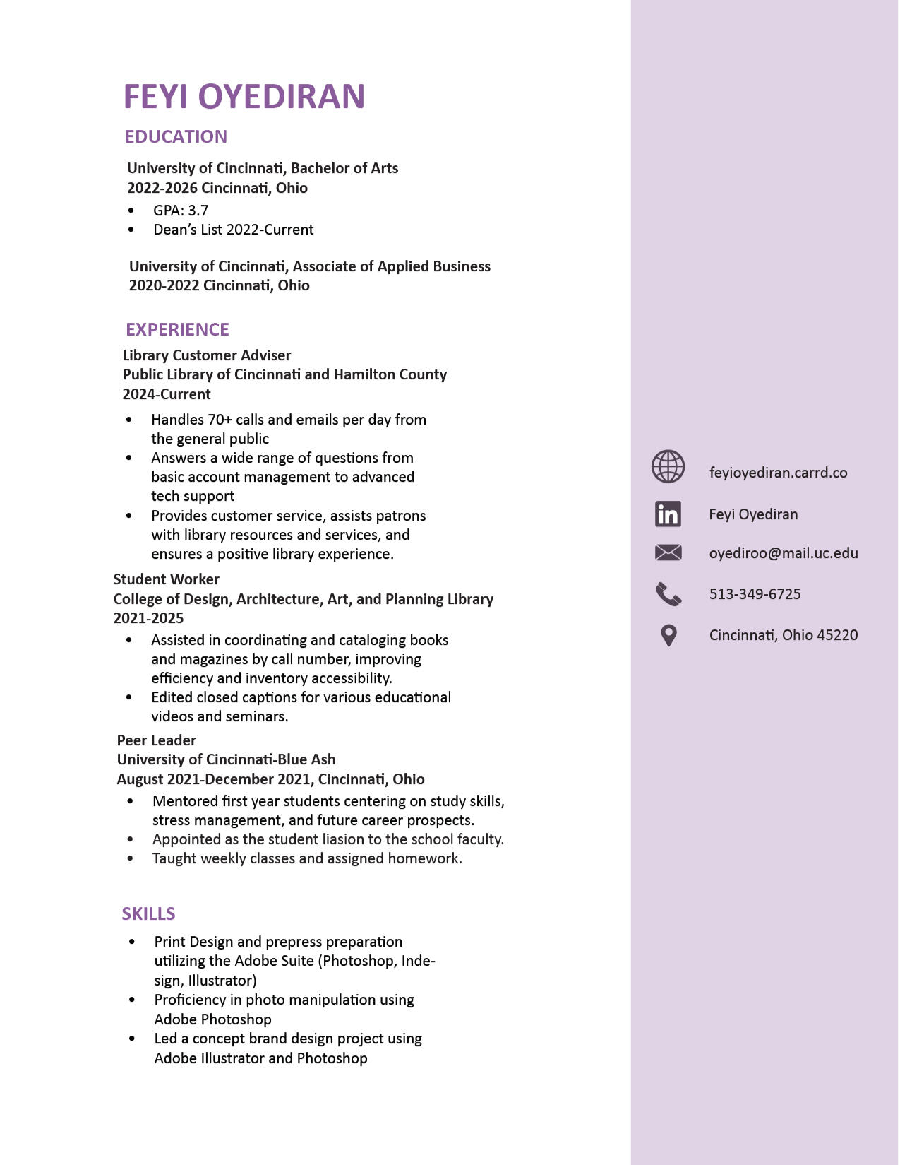 she/herFeyi Oyediran is a Cincinnati-based designer and artist studying at the University of Cincinnati. She previously completed her Associate of Applied Business at UC Blue Ash, with a concentration in communication design.513-349-6725